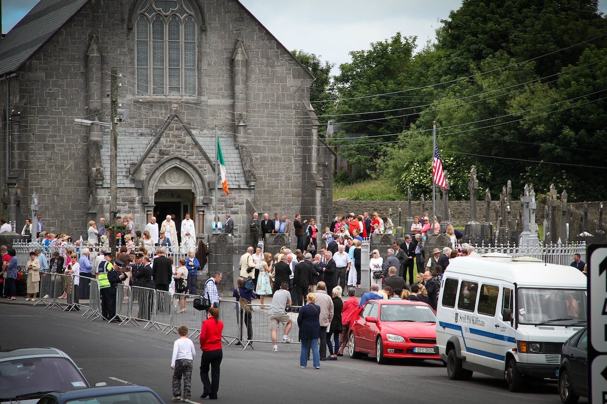 Upon arrival the family were greeted by the community around the church gates, the church being the first port of call to inspect the family baptismal records. Following the church event the hungry Kennedys attended lunch in the former Protestant Church and a family member sat at each table to shoot the breeze with all. At that point MB had to depart the occasion as he was involved in a surprise wedding elsewhere (more on that in next blog perhaps), bade his farewells and left them to it. The family later walked through the village to the former court-house where they dedicated the building to Caroline’s great-grandfather, and later visited a now disused graveyard where some family members are buried.