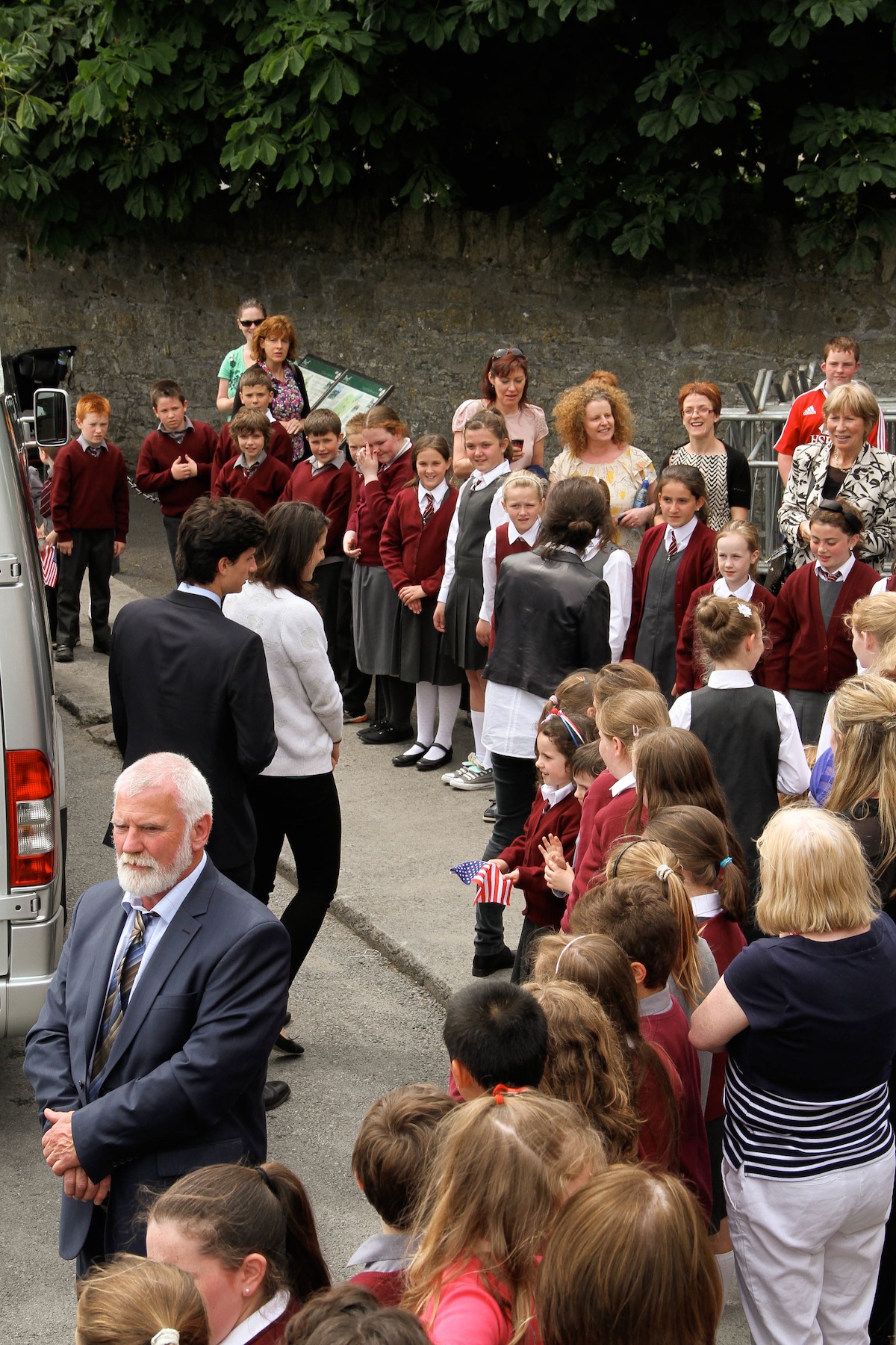The entire village was out bright and early on following day to greet the ‘home-comers’, more than 160 years after Caroline’s great-grandfather departed. News was filtering through that the expected arrival time would not be met, and this transpired in the end to be a 90 minute delay. The Kennedys had arrived in Dublin the previous day and had met with the President & Prime Minister. But the pangs of hunger attacked as they made the trip to Limerick and they pulled into the ‘Midway’ motorway service station for fish & chips or whatever. Hence the delayed arrival in the village.