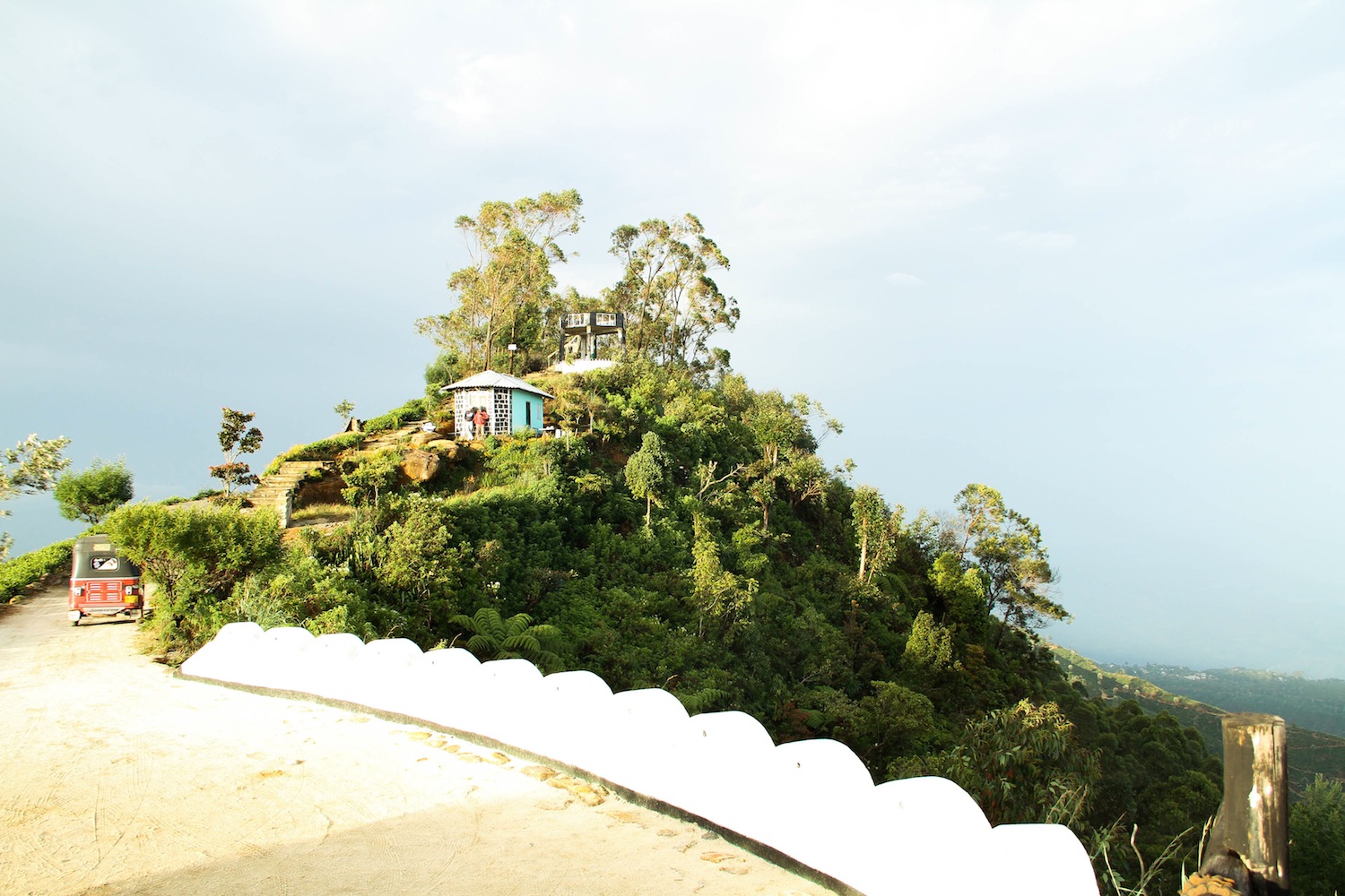 Senath’s tuktuk on left, tea shop up the steps, and viewing tower just behind at the top. View not great from the tower as obstructed somewhat by the trees