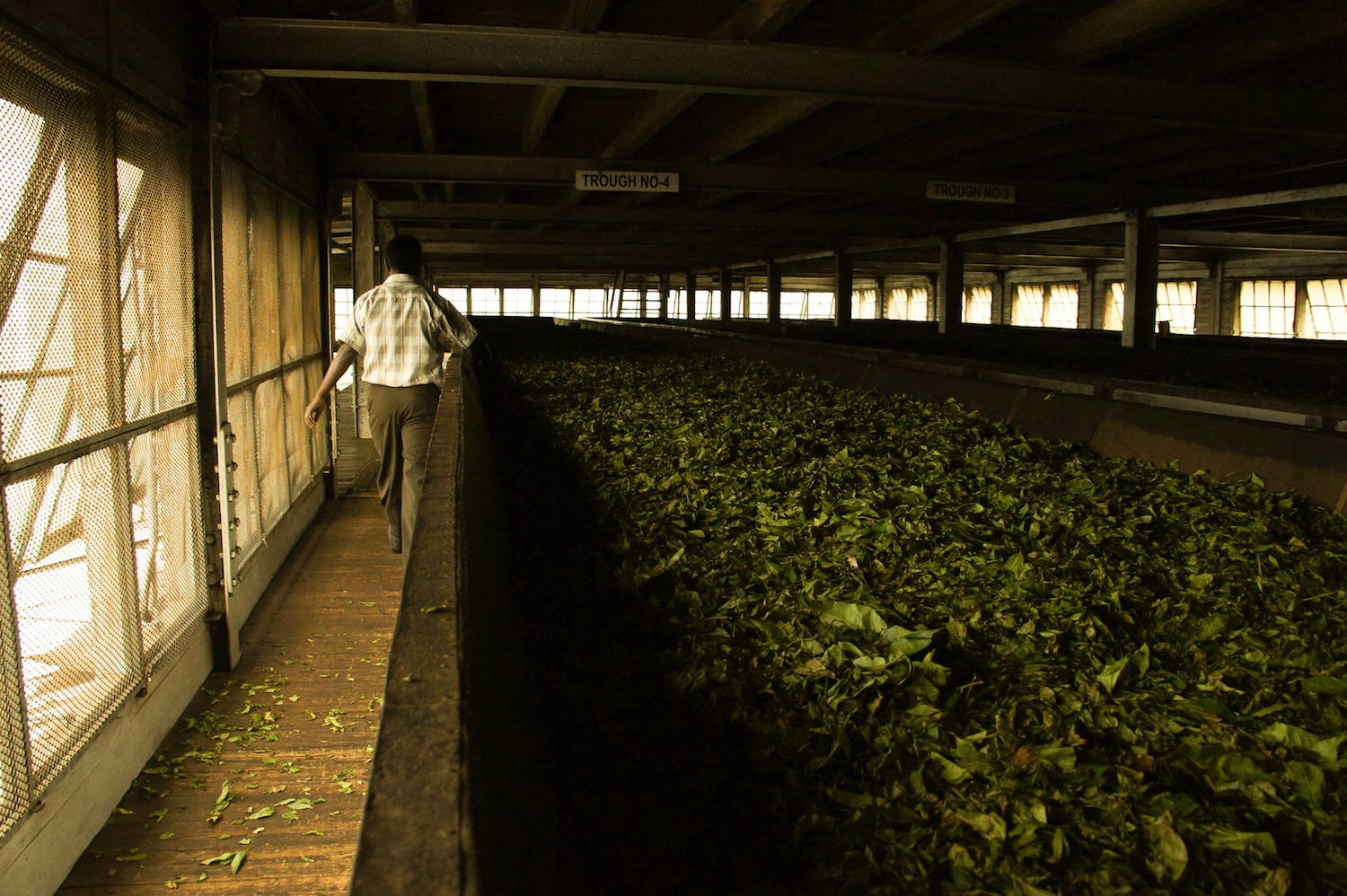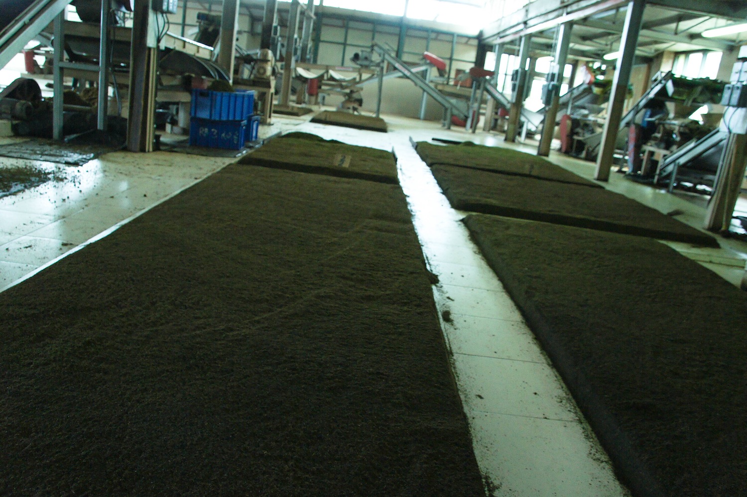 The tea leaves are dried on arrival at the factory to 45% moisture content before the processing begins