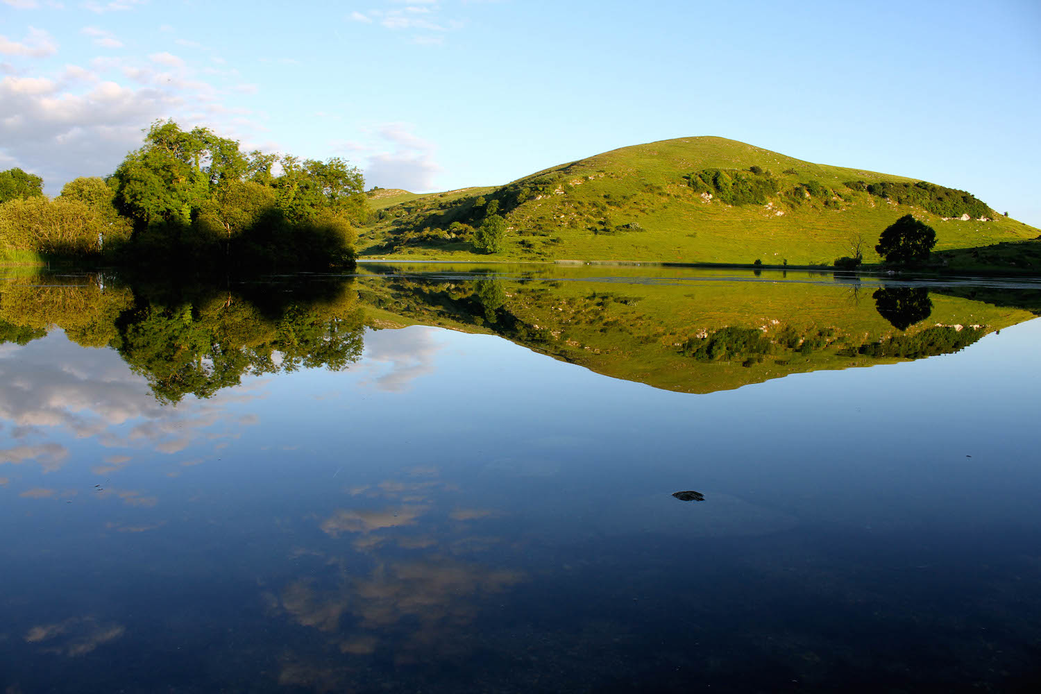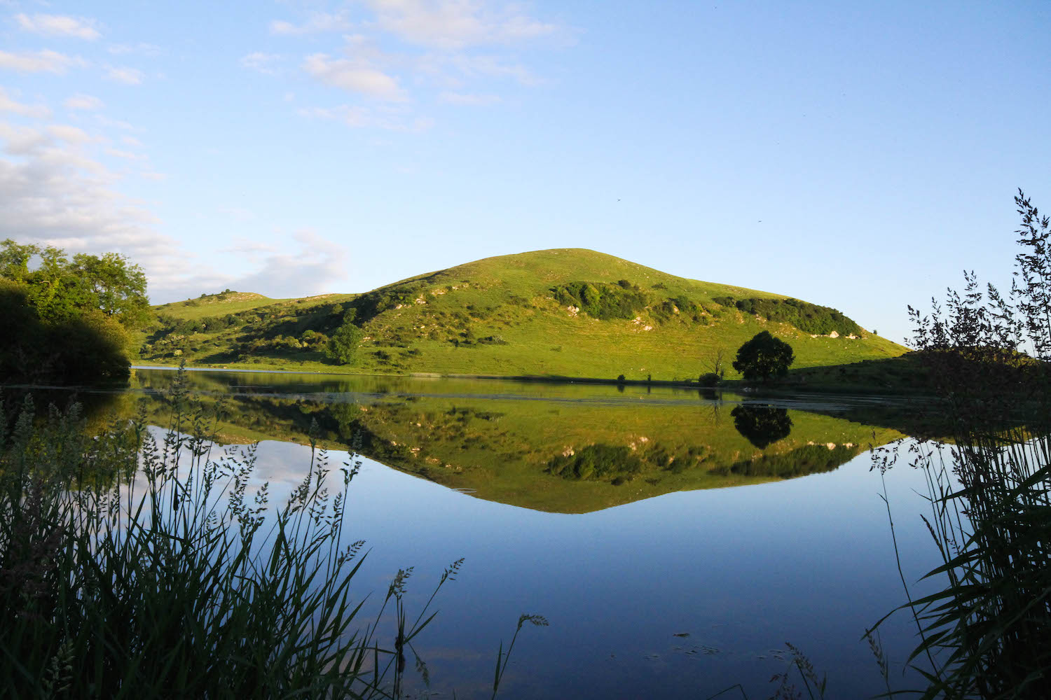 On arrival at the lake shore MB was momentarily stunned. Looking out towards the water it seemed to MB as if the whole world was visible upside down. Or downside up. And both looked the exact same. The windless sky, with only a smattering of small white clouds to put a little patchwork on the blue blanket, combined with the perfectly still lake surface to provide a glasslike mirror from the Gods. MB raised his camera to his eye. Click, click, click. And a few more.