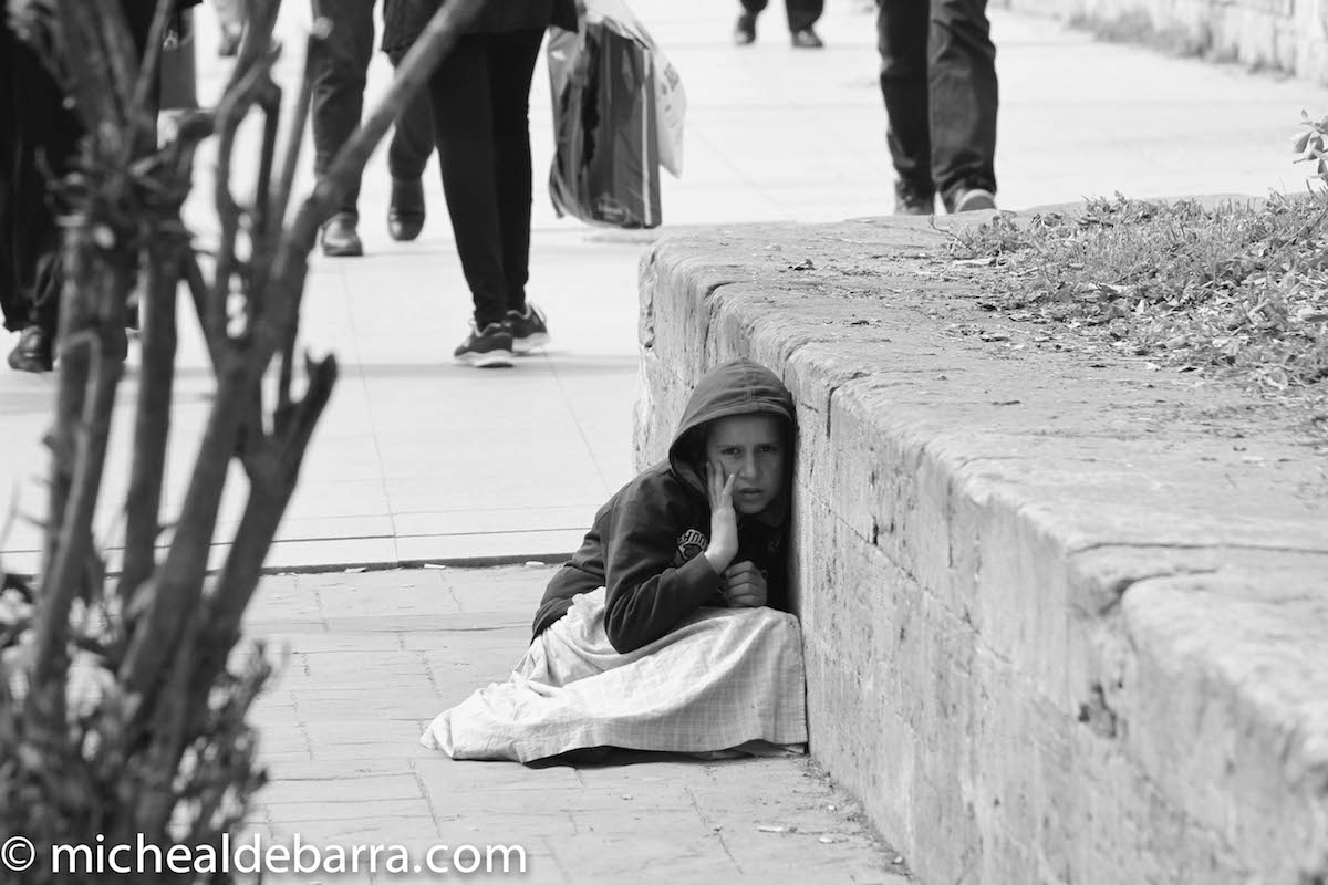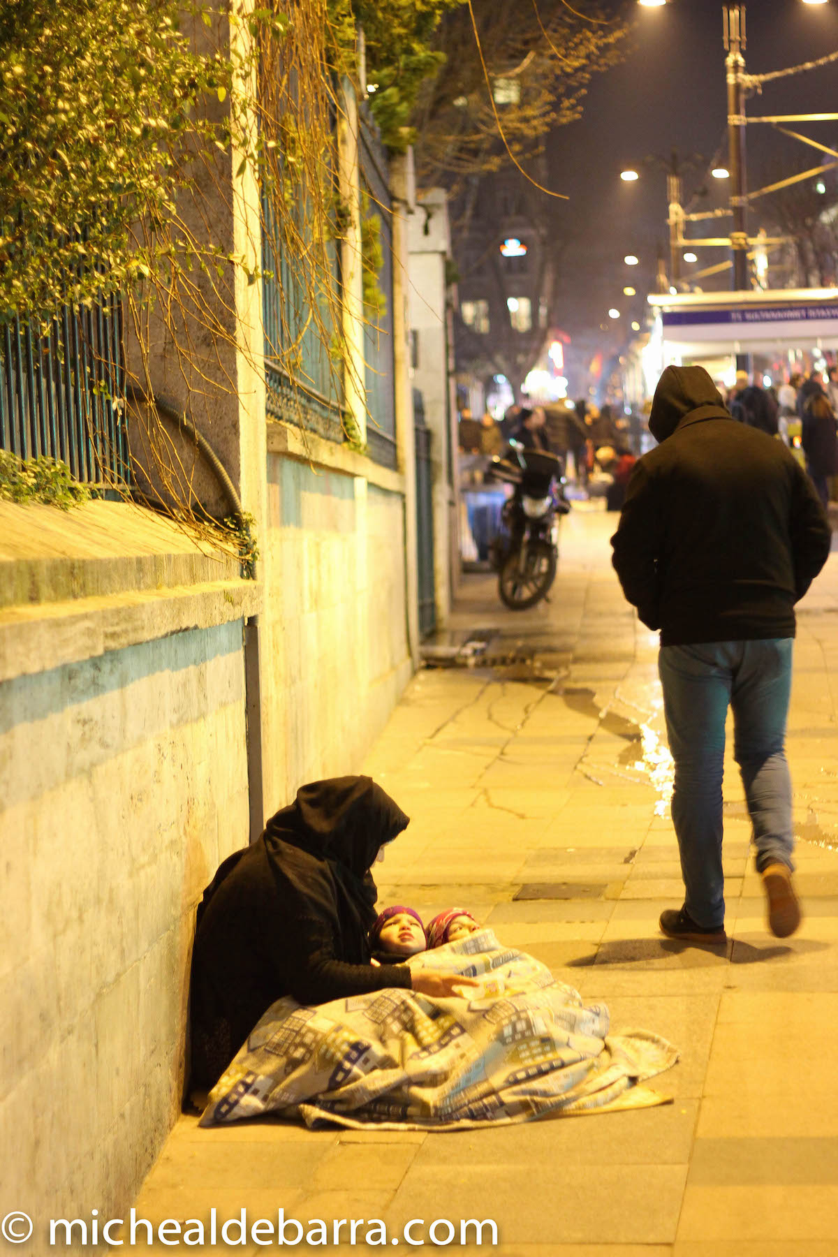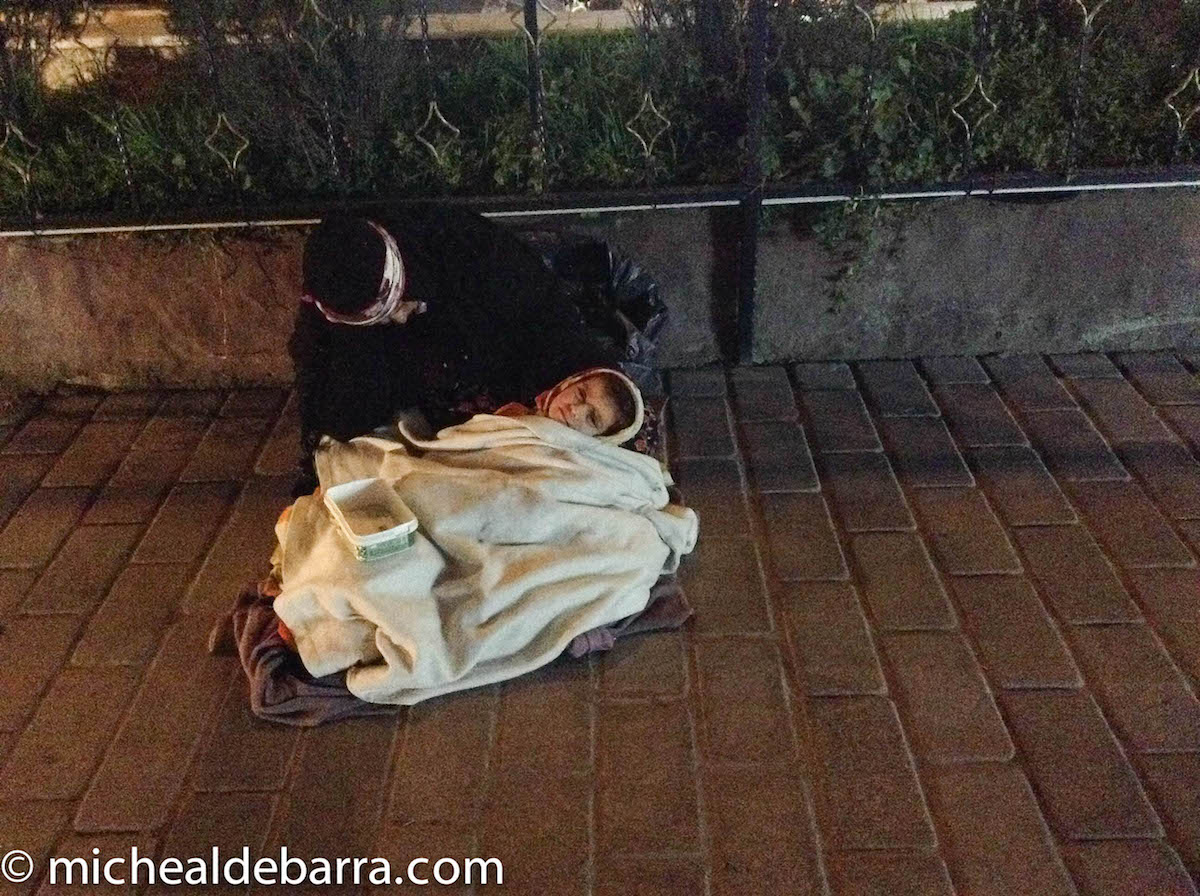 Outside MB’s hotel. MB passed this family a number of times over a few hours. The fathers head was at all times bowed facing the ground. Never once did MB see him look up. It seemed that he was in a state of shock and shame that he has found himself sitting on an foreign street begging for money, and this is the best he can do to provide for his family.