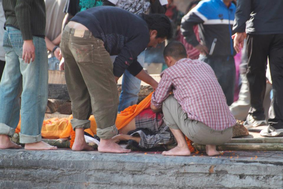 The cremation ceremony witnessed by MB involved the arrival of the dead body by Government ambulance. Family members dressed the body in an orange robe and proceeded to some concrete steps leading down to the river bank. The purification of the dead body takes place by dipping the feet of the body into the holy water.