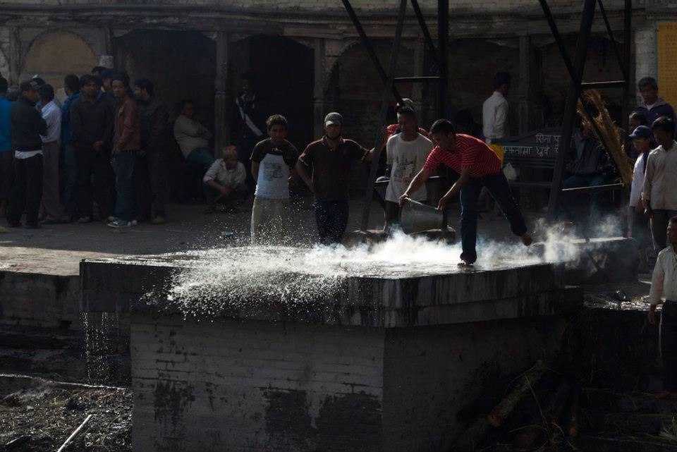 A family member places oils on the face and forehead of the body and straw is also stuffed into the mouth. The straw is then set alight, and at this instant the soul is deemed to be released and the body is considered truly dead. The straw and timber underneath the body are then set alight and the body is reduced to ashes which are washed with a few buckets of river water into the holy river. Sugar is thrown on the burning body from time to time to prevent foul smells wafting from the fire.