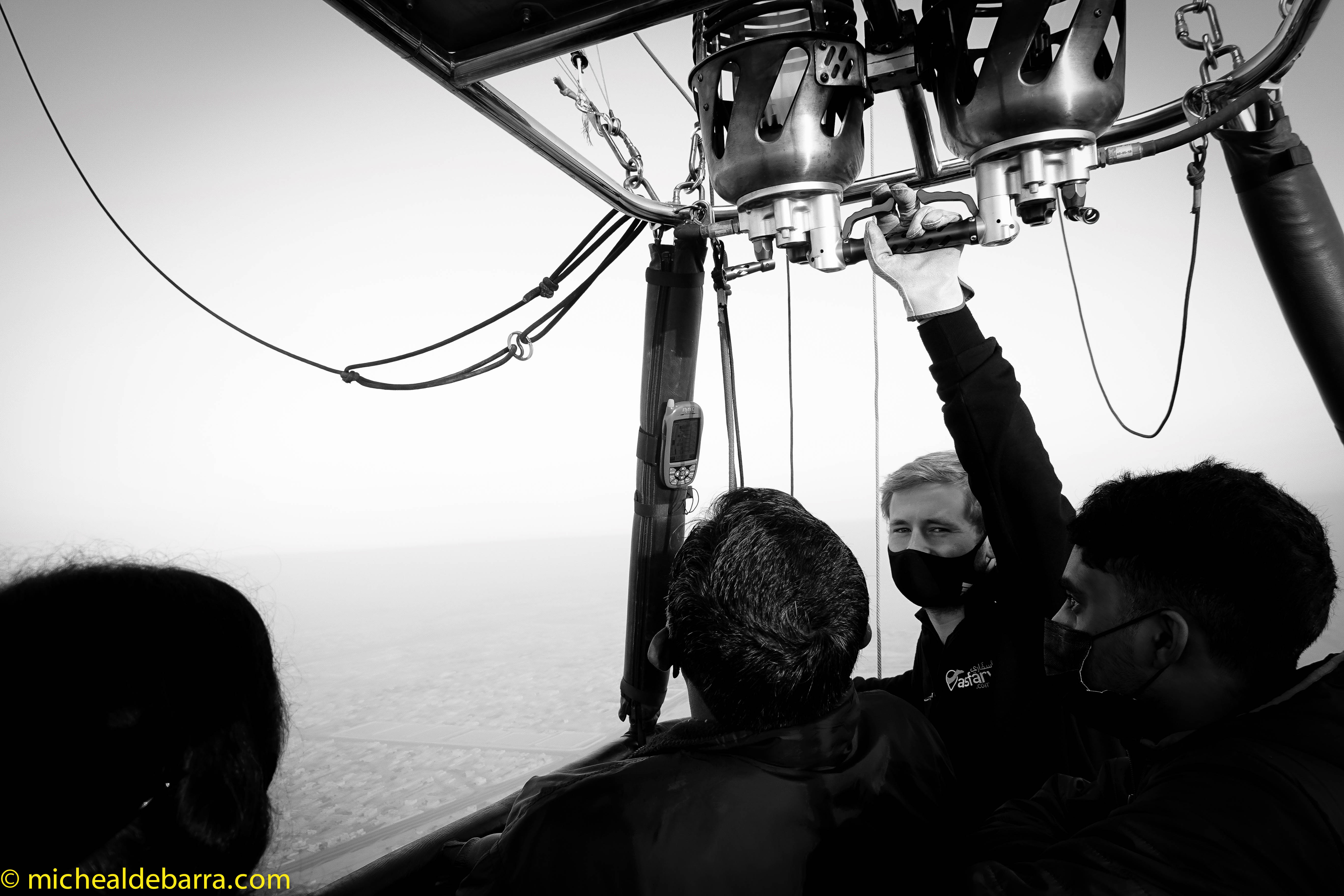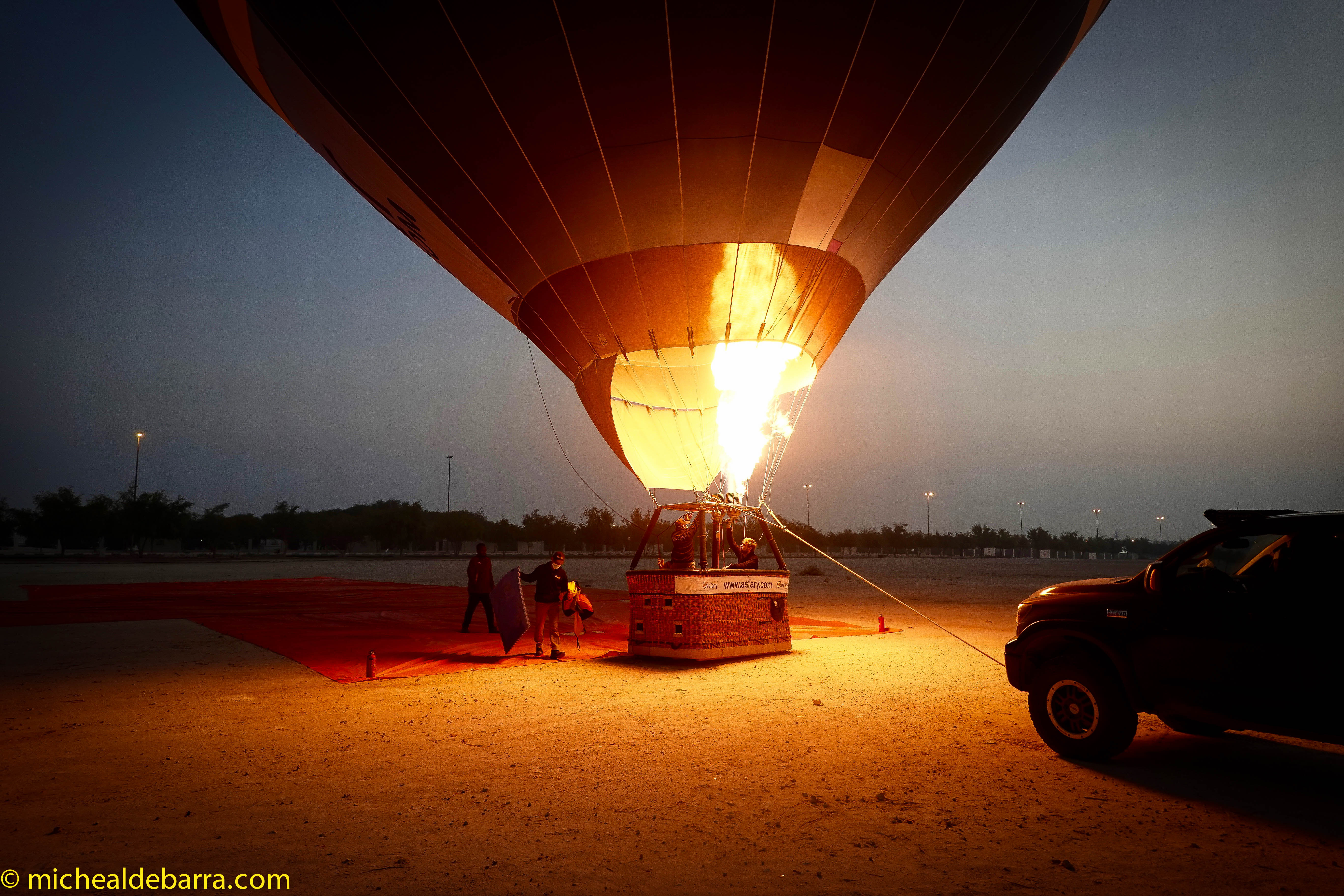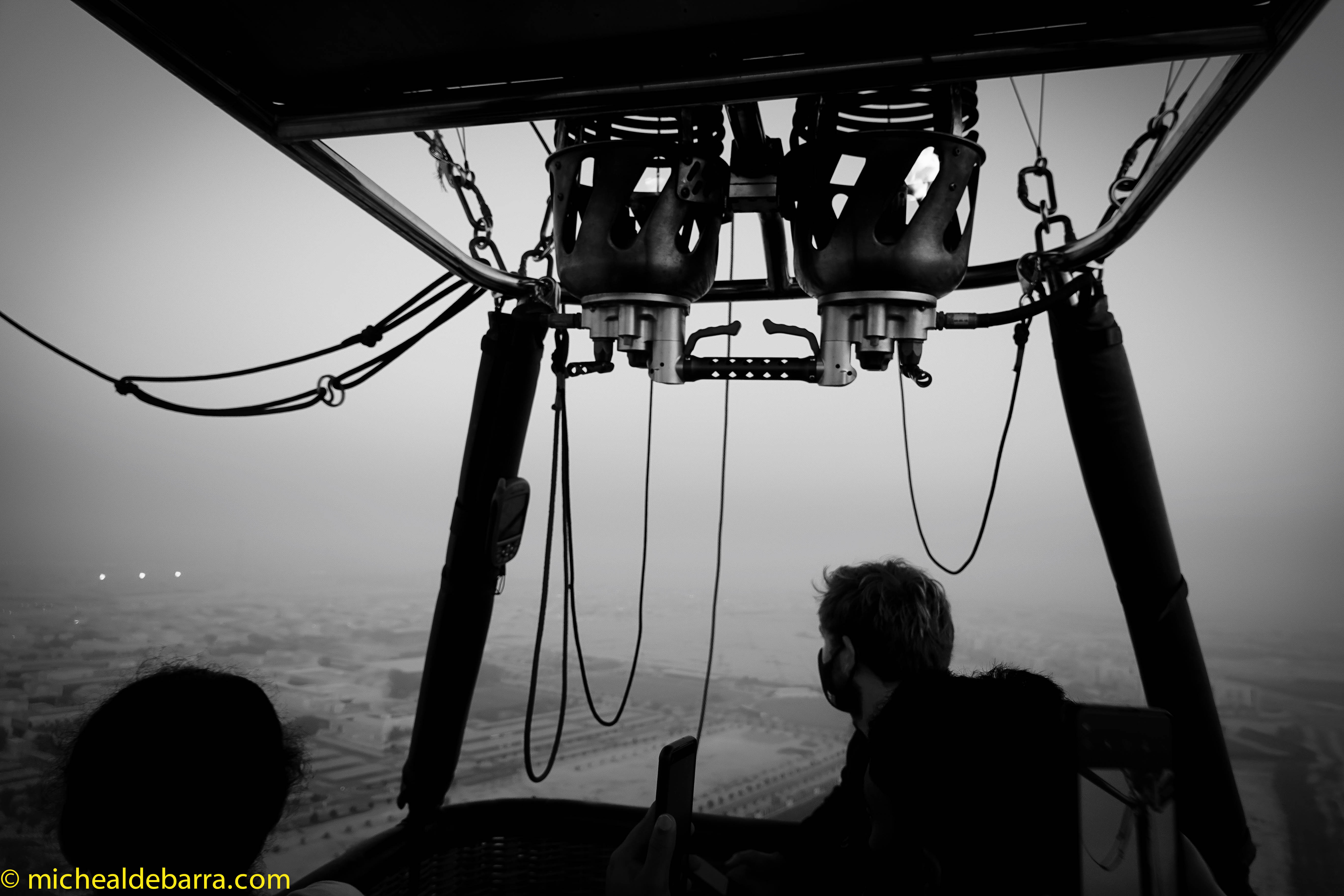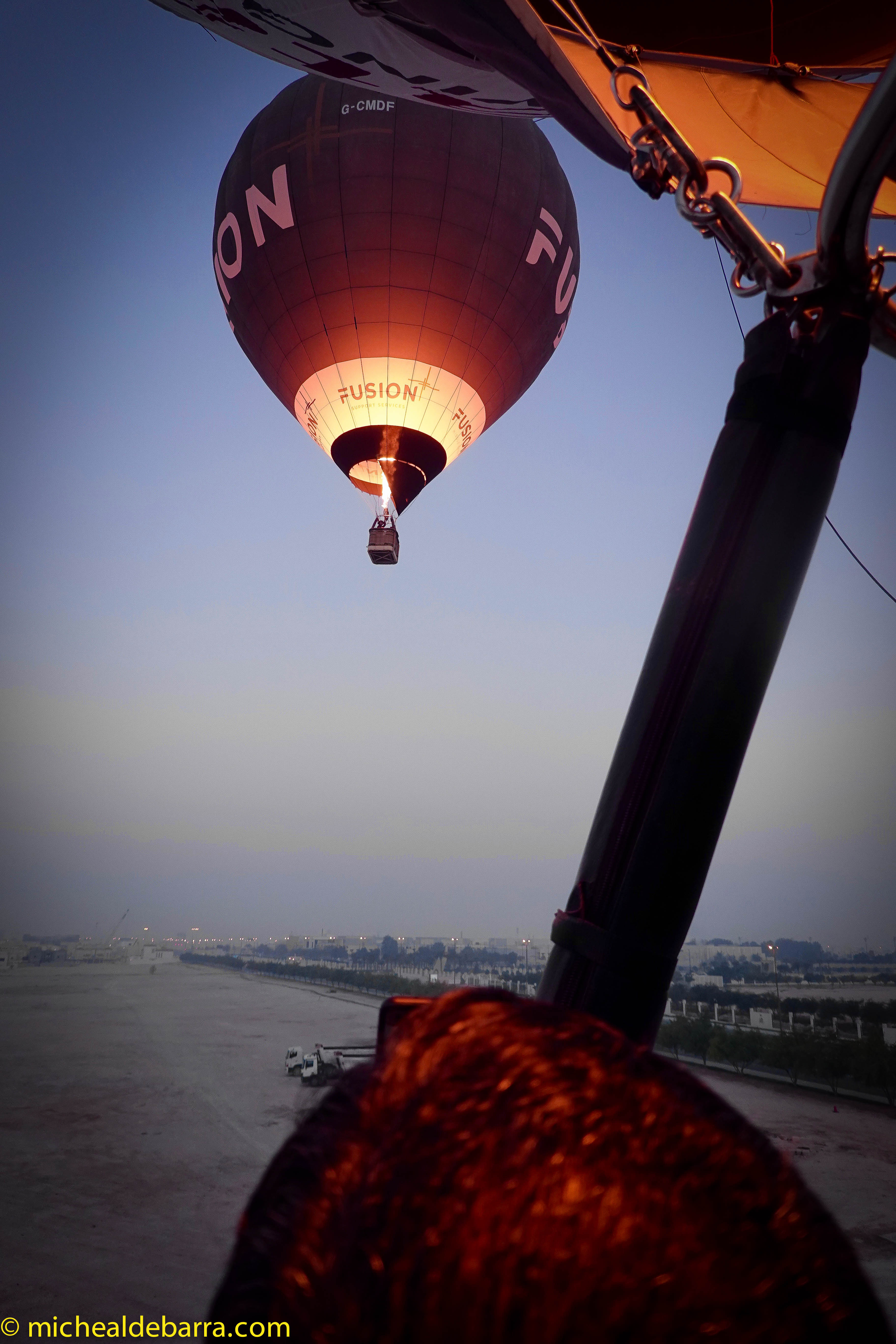 The balloon was first pumped full of cold air using a motorised fan, and in the later stages the young English balloon pilot called Pater pressed the handle of the burner and the influx of hot air caused the balloon to rise vertically. MB’s balloon, and a basket full of Qatar residents, rose into the Doha sky, one of two balloons that young balloon pilot Peter reported over his radio to the air traffic control tower at a nearby airport. MB prayed that the air traffic control lads took young Peter the pilot seriously, as MB could think of nothing worse than an Airbus A380 ploughing at high speed into MB’s basket in the semi-darkness of the Doha morn. In any event, any planes seen over the next 60 minutes or so were many kilometers south of MBs location. ‘Rodger that’ replied some voice from the tower.