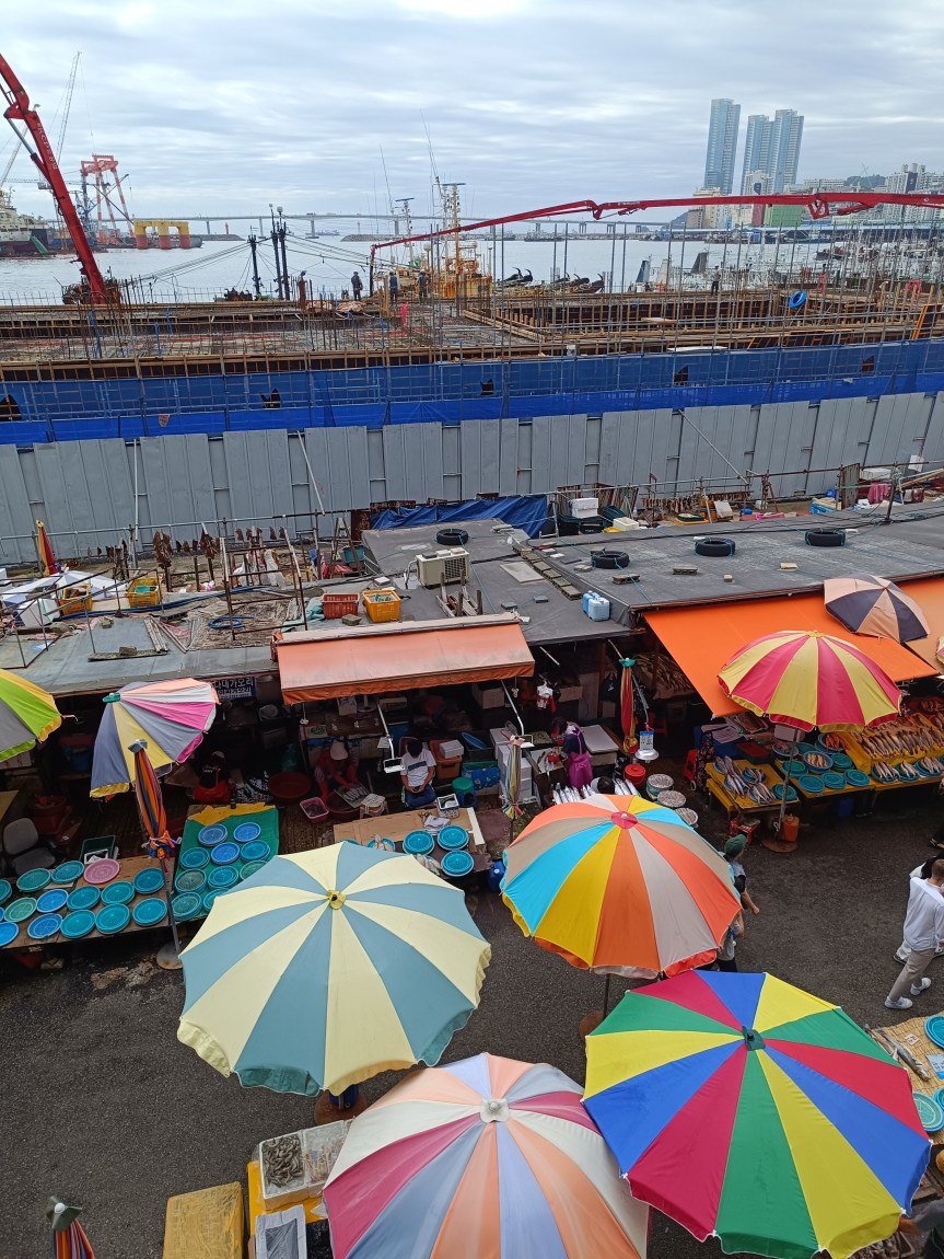 The largest fish market in Asia is the Busan fish market. It’s a must-visit spot if you are ever visiting the city. There’s a fish auction at 5.30am every morning as the fish-catches are sold to the fish traders, who then sell the fish to the public from the hundreds of market stalls that dot the streets of the locality. The Korean Thanksgiving Festival is almost upon us and the traditional fish that honours the occasion is octopus, hence lots of octopus was on sale during MB’s walk-about. Boats from Russia load king prawn (which Koreans are not so keen on) in the harbour and take it back to their their homeland. Chinese boats are also present and take other varieties of fish to theirs.