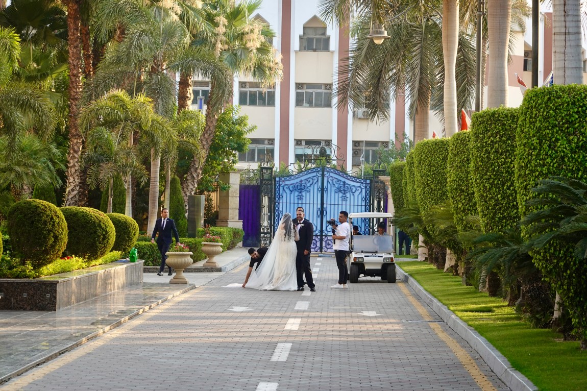 The wedding venue was a ‘wedding resort’ in Cairo called Al Masa Hotel that has no equal in Ireland in terms of scale. It is owned by the Egyptian army, stands next to the Ministry of Defense, and is a stunning 5-Star complex. It has some 5 wedding halls, so multiple weddings can be celebrated on any given day. The gardens and surrounding complex woodlands are manicured to ‘Augusta GC’ standards and many restaurants are hidden amongst the trees to be discovered as one wanders about the extensive lavish grounds.