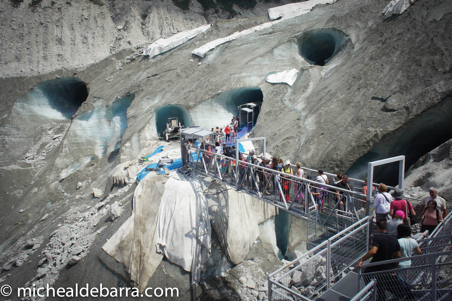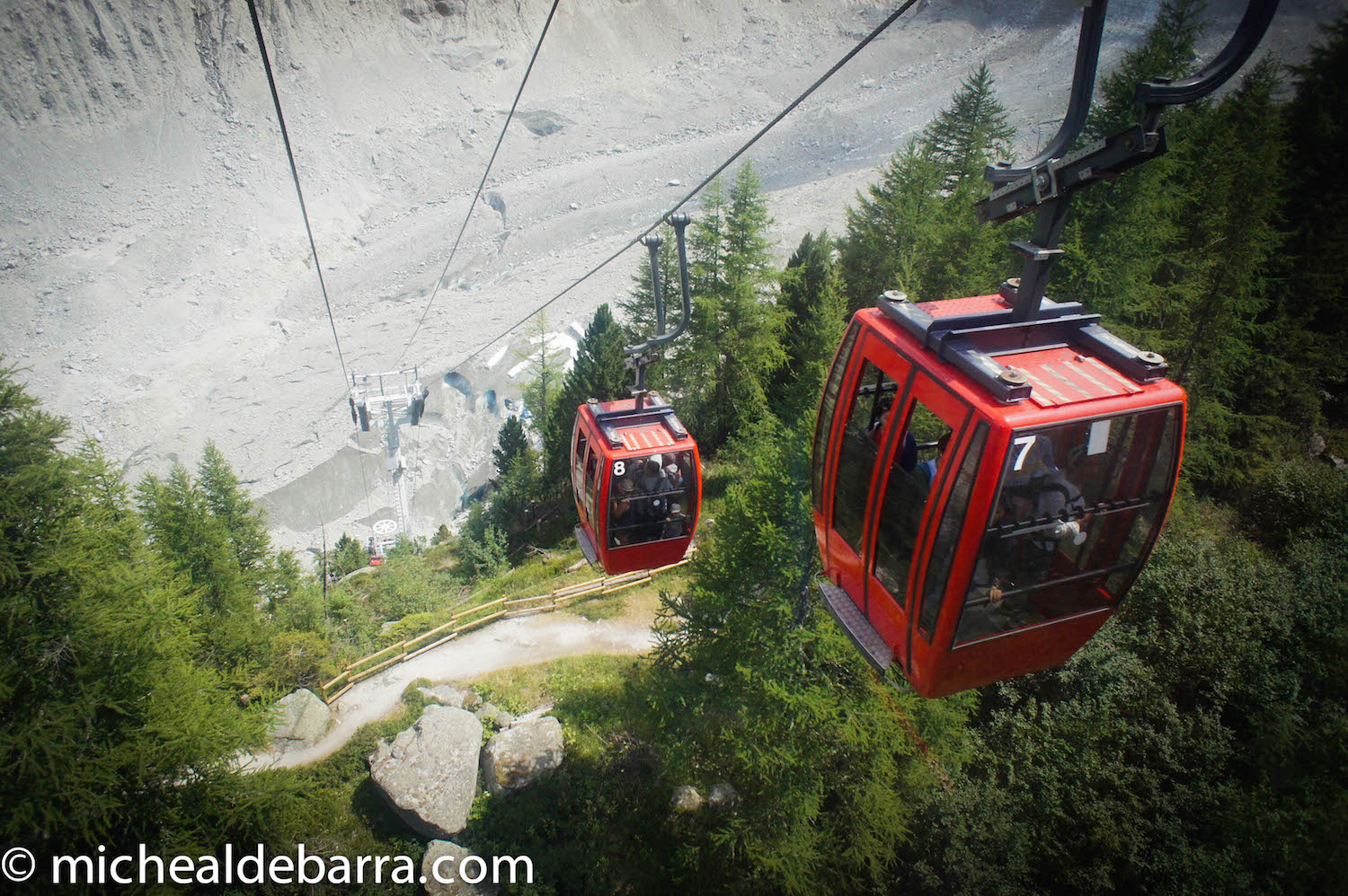 An old two-carriage train connects the village of Chamonix in the French Alps to a hill station next to the Montenvers glacier. The thirty-minute train journey through the mountains is followed by a short cable car ride that connects the hill station to the glacier at the bottom of the glacial valley, almost. A walk on foot down some 450 steps completes the journey. For the unfit, the walk back up later on can be a struggle.