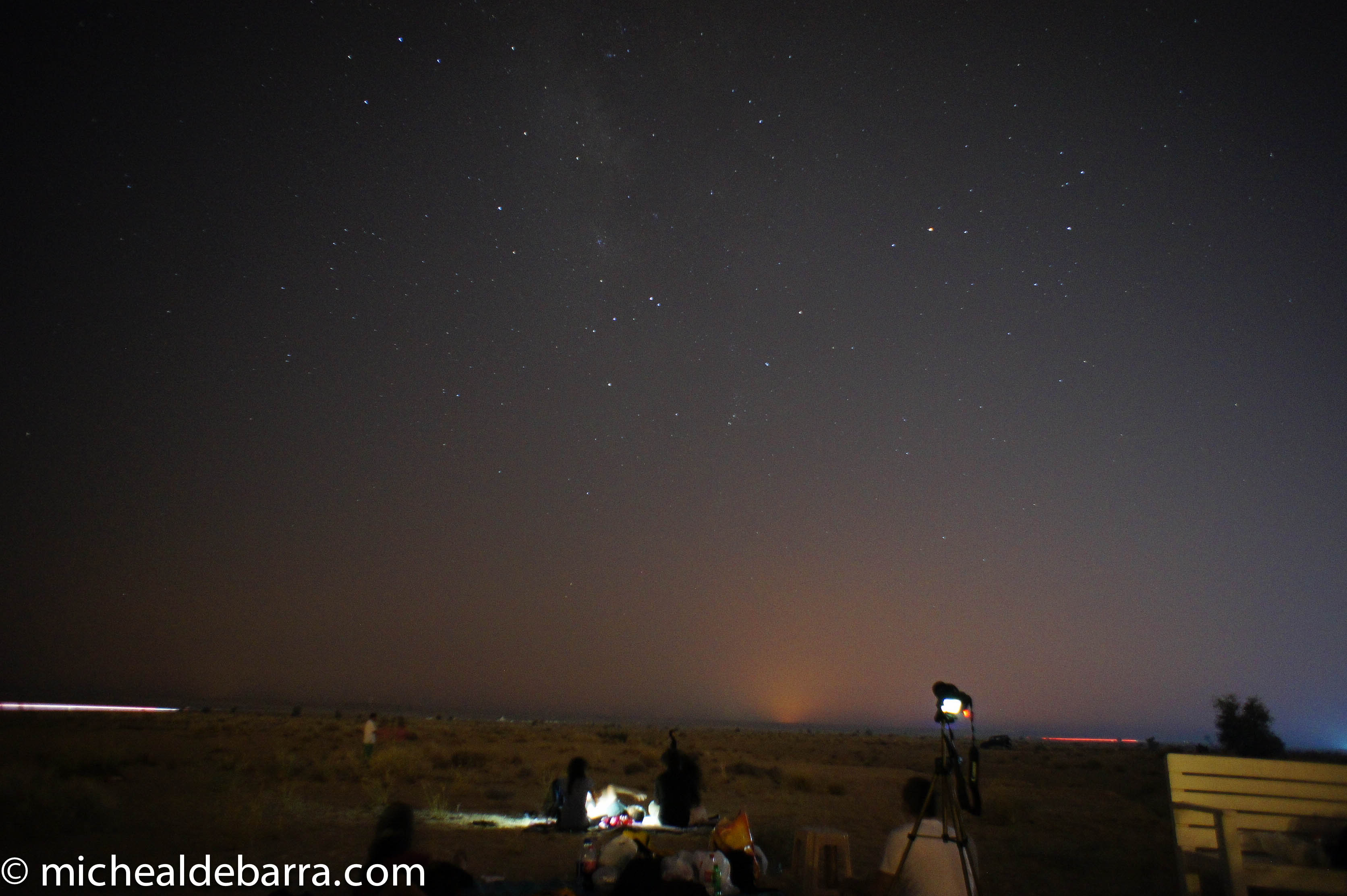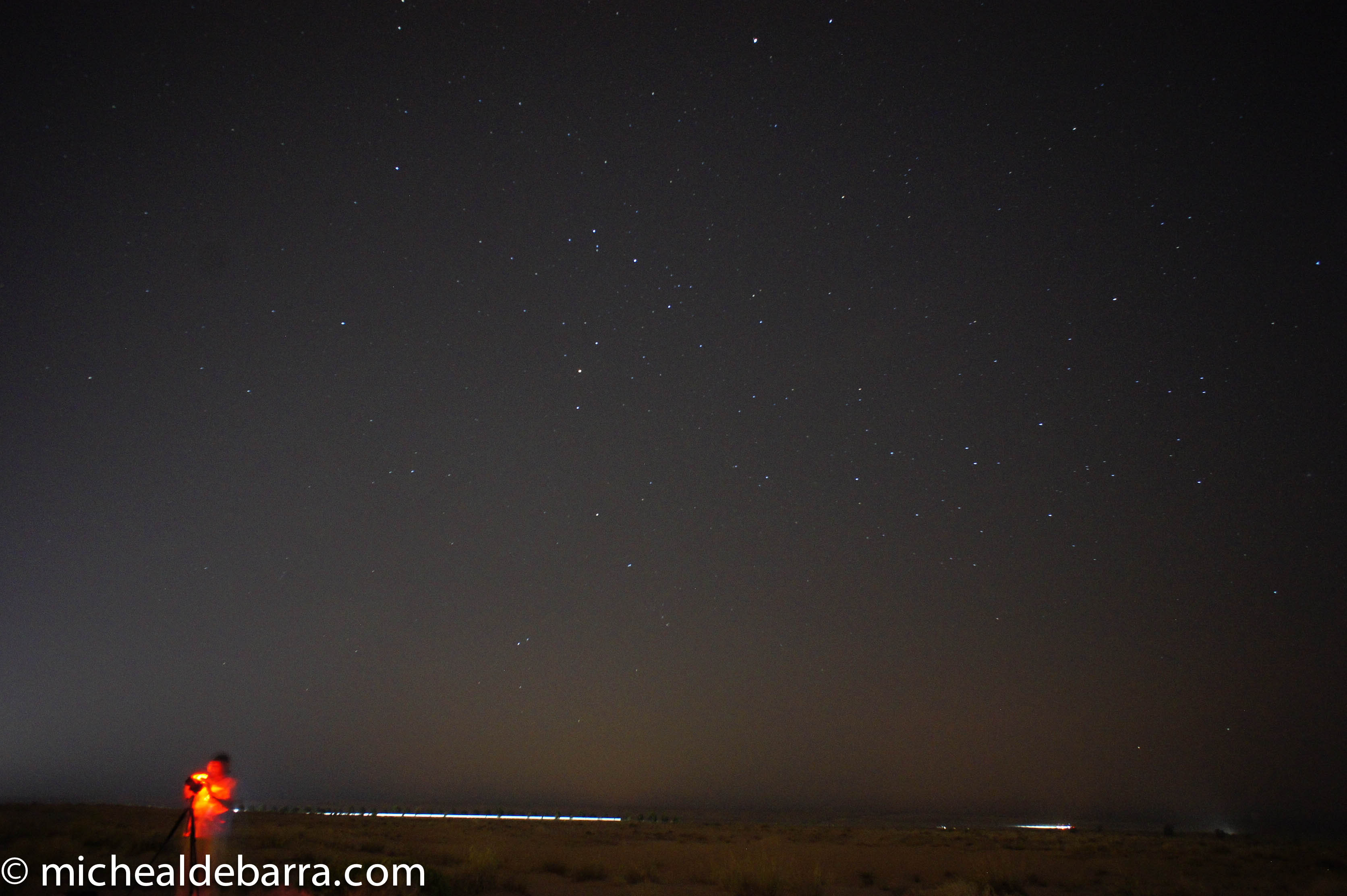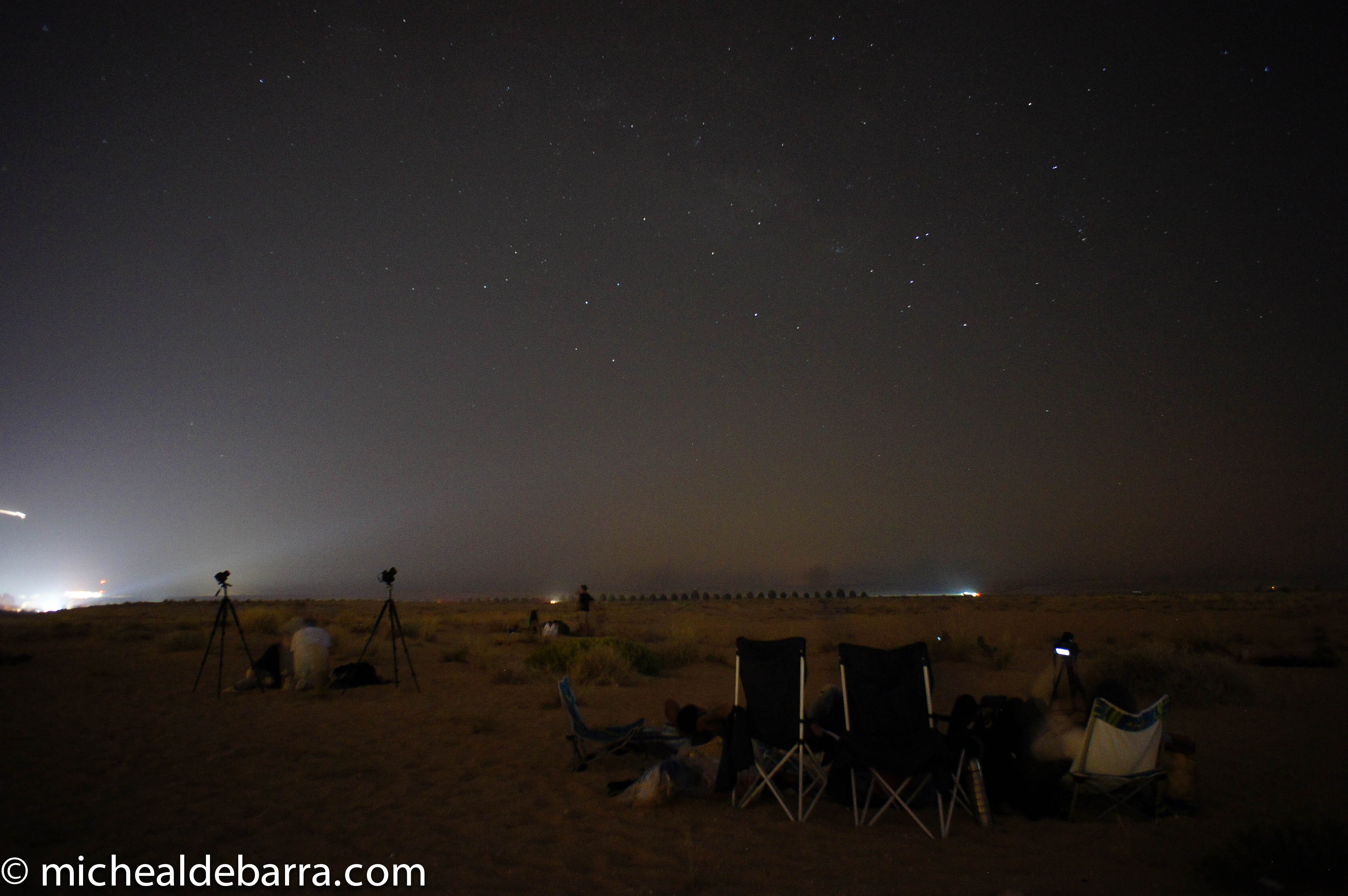 MB gives you one of his pics from the evening. A couple of stargazers stand ready to capture the ‘200 to 1,000 per hour’ spectacle (not!!!), the lights from a nearby village shine brightly behind them, the headlights of a passing car leave a bright trail of light on the bottom right, a desert tree is lit up by the lights of the adjacent resort and some stars pepper the night sky.