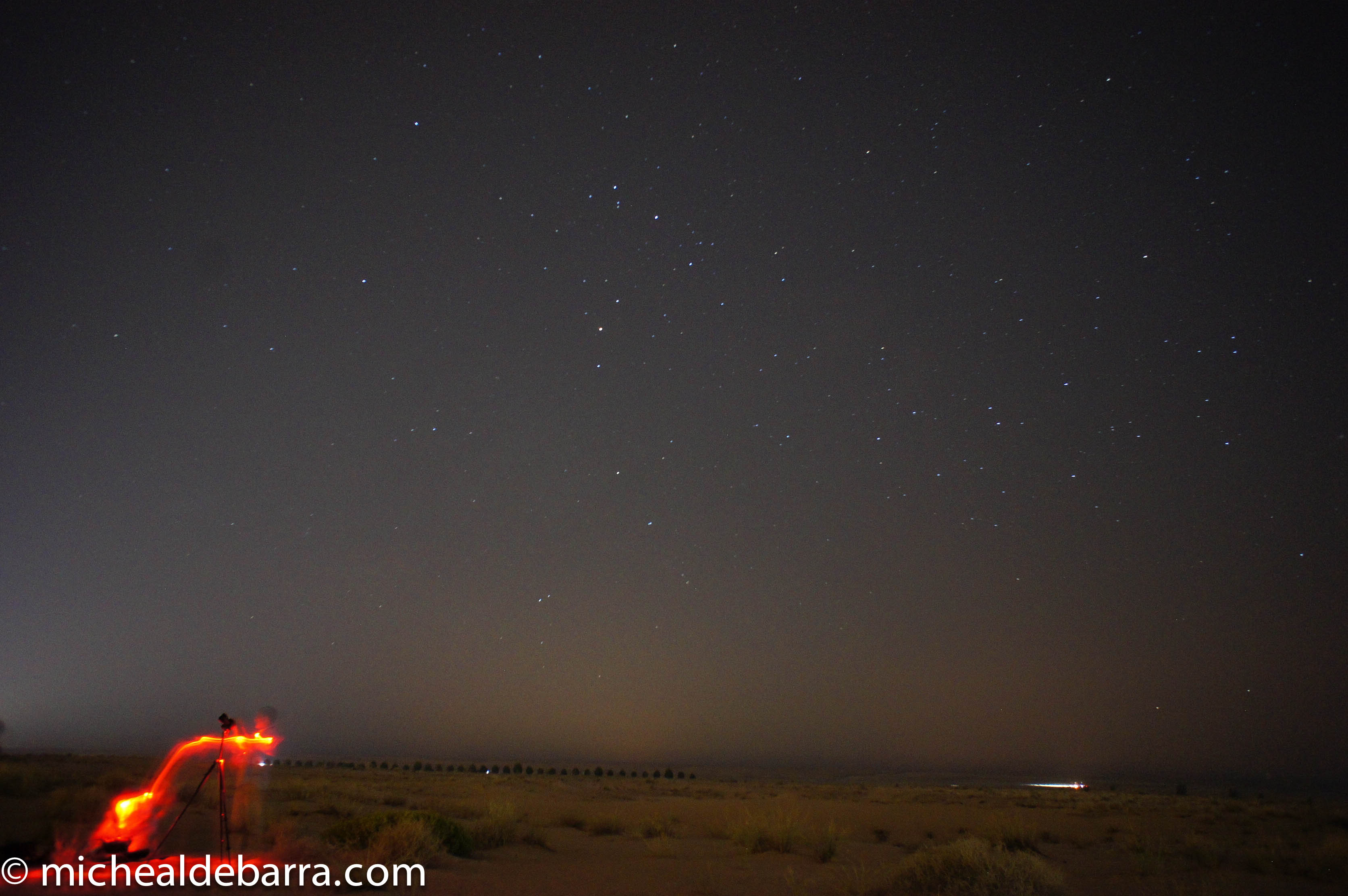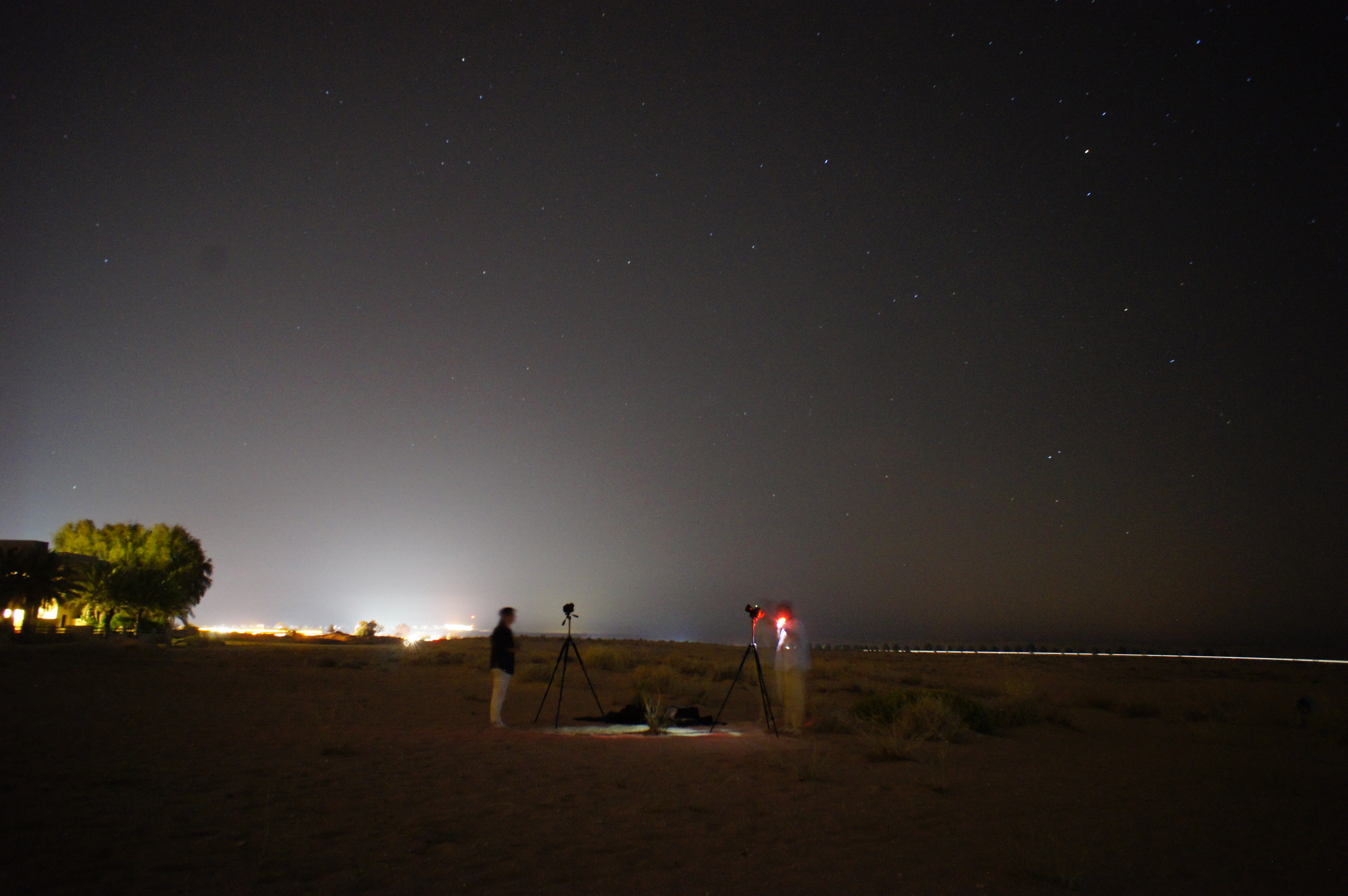 MB did witness distant planes as they flew into Dubai or Sharjah airports which are both relatively nearby. And someone lit a red Chinese lantern – which glowed brightly as it burned and rose into the heavens. MB assumed one of the Astronomy Club lads lit it, to remove thoughts of lynching from our minds. Some distant cars passed into the night providing opportunity for light trails in your photo, if you were of a mind to shoot light trails at ground level, when the ones you really wanted were in the sky.