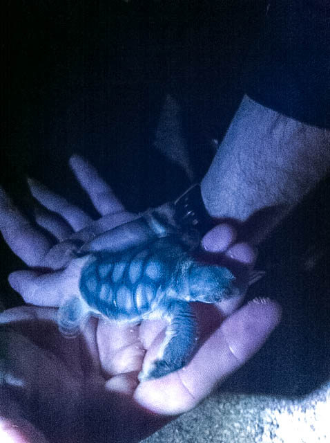 I was unsuccessful in finding any hatchlings until the second last night, when I was digging out a nest, and there about 2 feet down – a little hatchling. It was amazing to see this process. When they come out of the shell they have a food source like the yoke of an egg attached to their tummy. They eat this and get the energy to dig their way out of a nest that is 3 feet down in the sand, make there way down to the beach and swim for the next 24 hours for survival. Truly amazing stuff when you see how small there are………