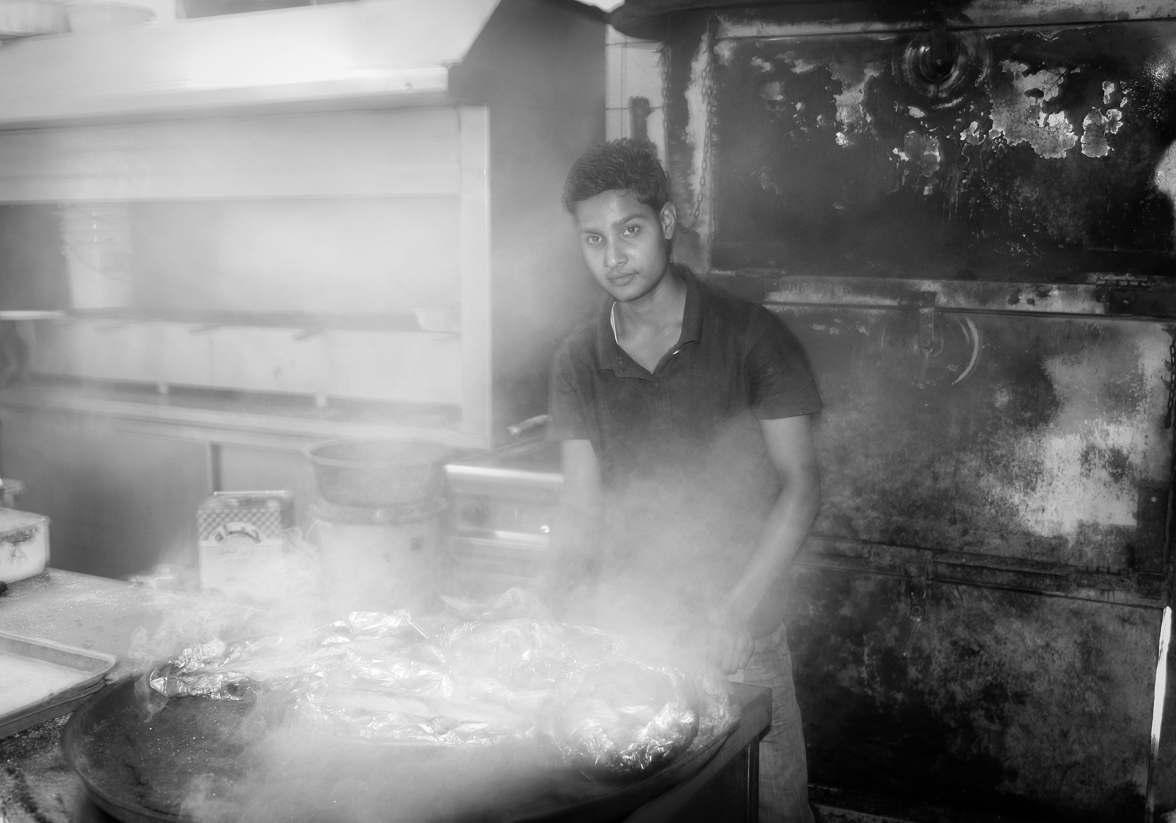 Steaming fish and worker at the fish ovens, Ajman Fish Market, UAE.