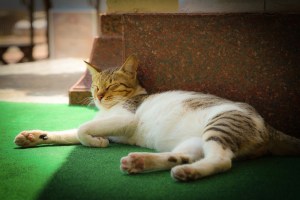 A Muslim cat lazes in the morning sun at the Mosque entrance