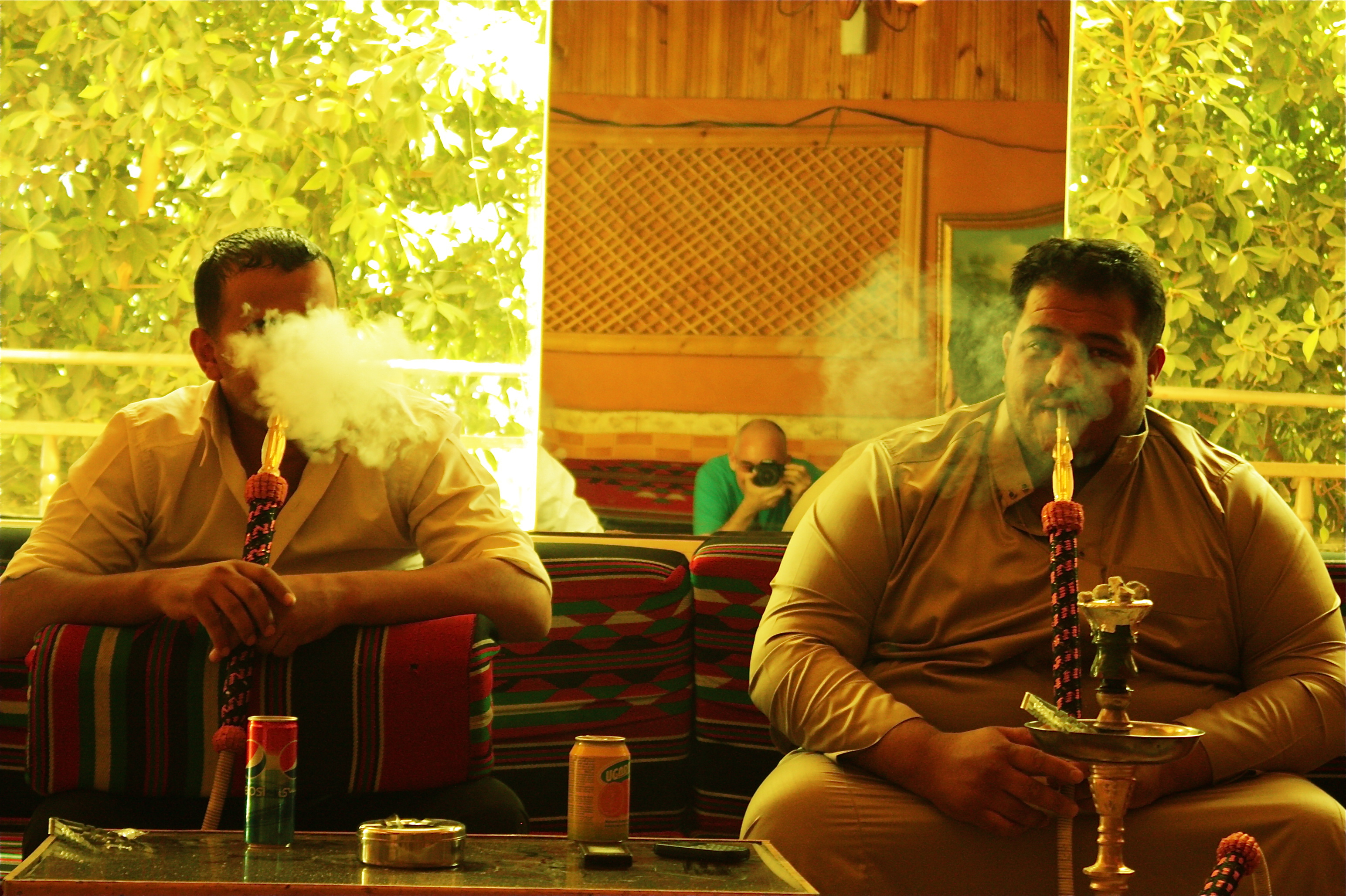 One can see designer handbags in the shot, and all three ladies are smoking shisha from shisha water pipes (see the standing pipe next to the lady on the right). Even though more religious Muslims consider shisha, or smoking generally, to be haram (religiously forbidden), you will witness shisha-smoking in almost every restaurant in the entire Middle East, haram or not!